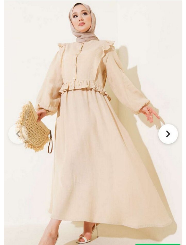 Bol kesim, fırfırlı detaylara sahip bej uzun keten takım. Yüksek yakalı ve askılı kolludur, günlük kullanıma uygun mütevazı bohem tarzda.marka öylesine girildi