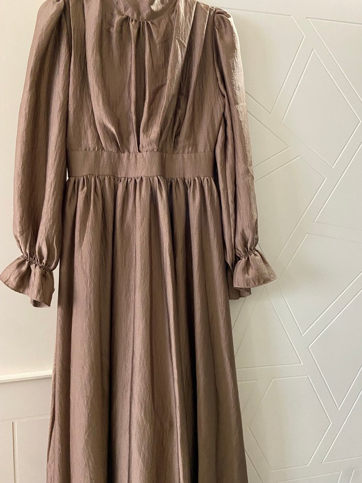Bej renkli, keten kumaştan uzun elbise. Pileli detaylara ve yüksek yakaya sahip, uzun kollu ve bol kesim. Modern klasik ve vintage şıklık sunar.