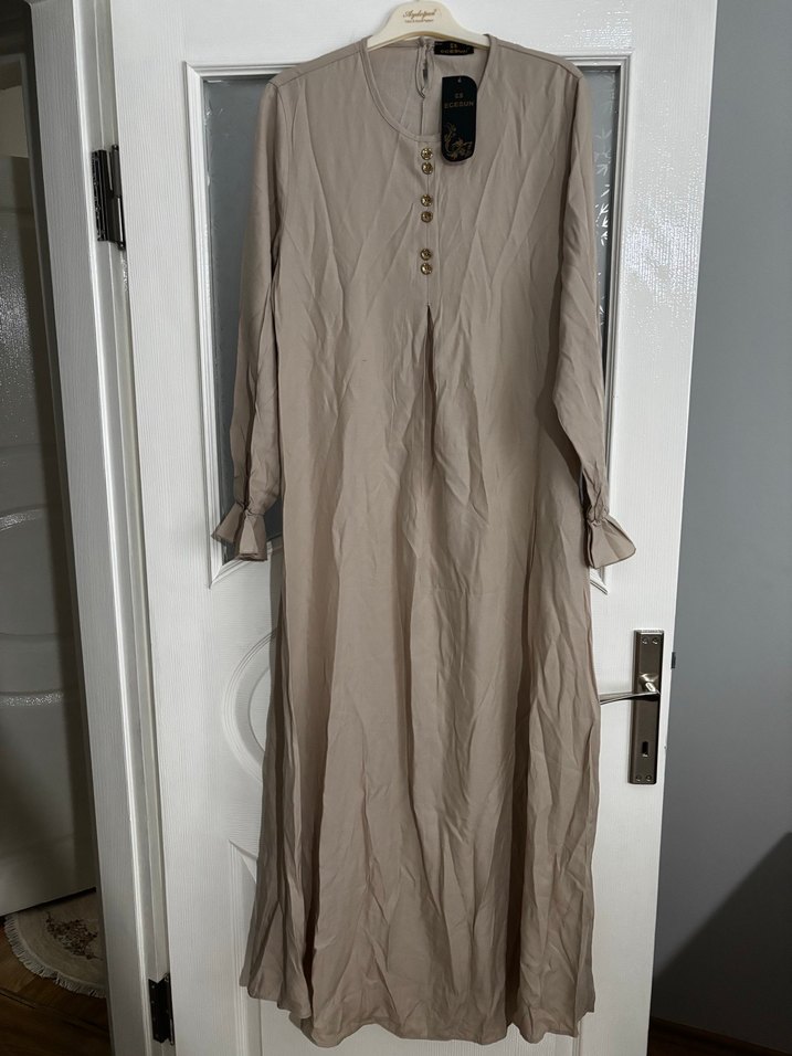 Bej uzun keten elbise, düğmeli, uzun kollu ve bol kesim. Yuvarlak yakalı, minimalist ve sade tarzda, günlük kullanım için uygundur.