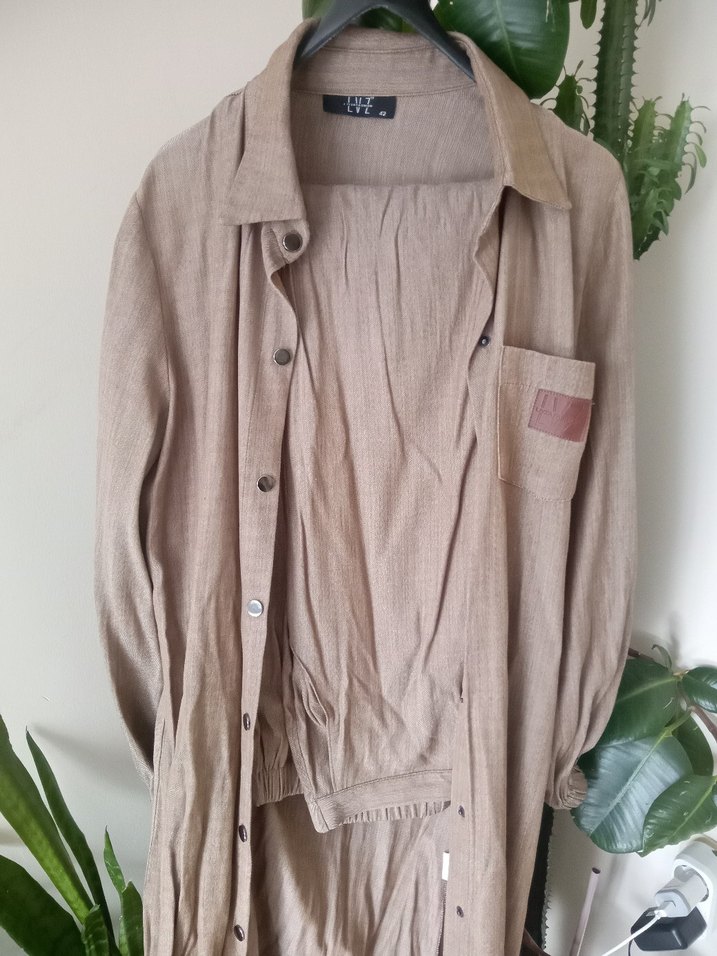 Bej renkli, keten kumaştan, uzun kollu, düğmeli ve rahat kesim kadın gömleği. Günlük kullanıma uygun.