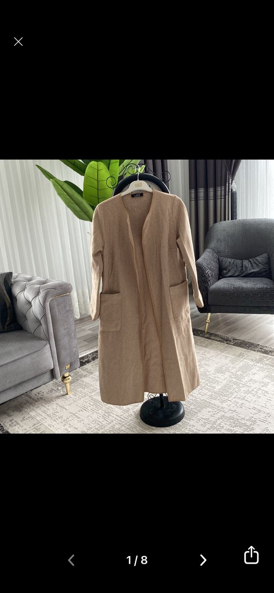 Bej uzun keten kaban, kesik yaka ve uzun kollu, rahat kesimiyle günlük kullanıma uygun şık bir seçimdir.