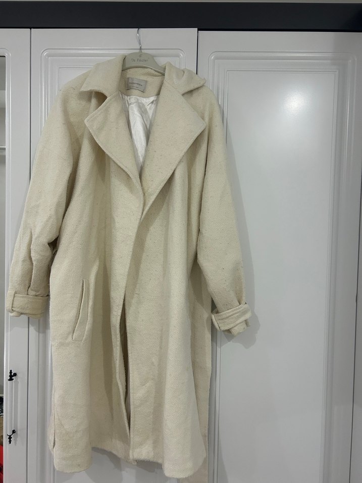 Bej renkte uzun keten kumaştan, geniş kesimli ve yakalı kadın palto. Minimalist ve şık tarzda, günlük kullanıma uygun. S-M bedene uyar