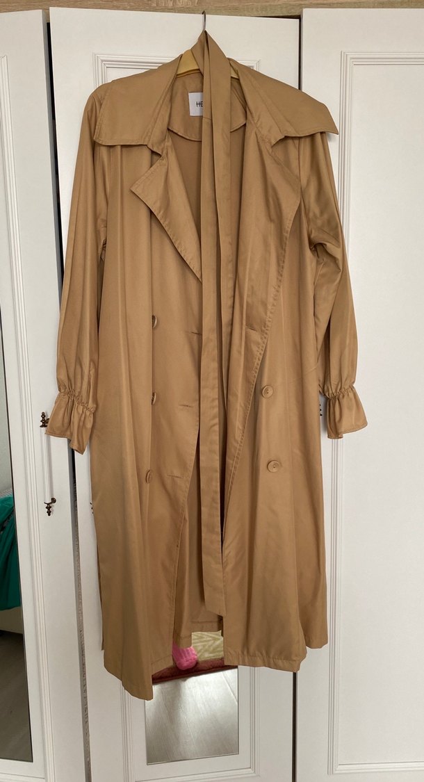 Bej renkte, uzun keten kumaştan yapılmış, düğmeli ve işlemeli uzun kollu, bol kesim trençkot. Paris tarzı, günlük sokak modasına uygun.