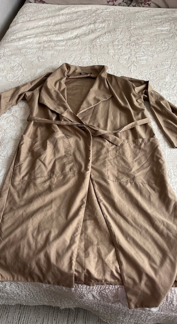Bej renkte, uzun kesim keten kumaştan yapılmış, drapeli ve kesik yakalı, uzun kollu, bol kesim kadın trençkot. Rahat ve günlük kullanıma uygun.