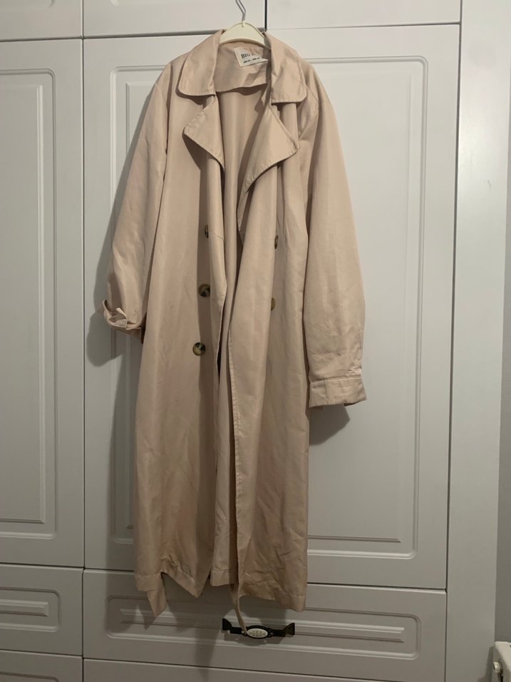 Bej renkli, keten kumaştan yapılmış, uzun ve bol kesim kadın trençkot. Yaka kısmı kesik ve düğmeli, günlük sokak stili için uygun.