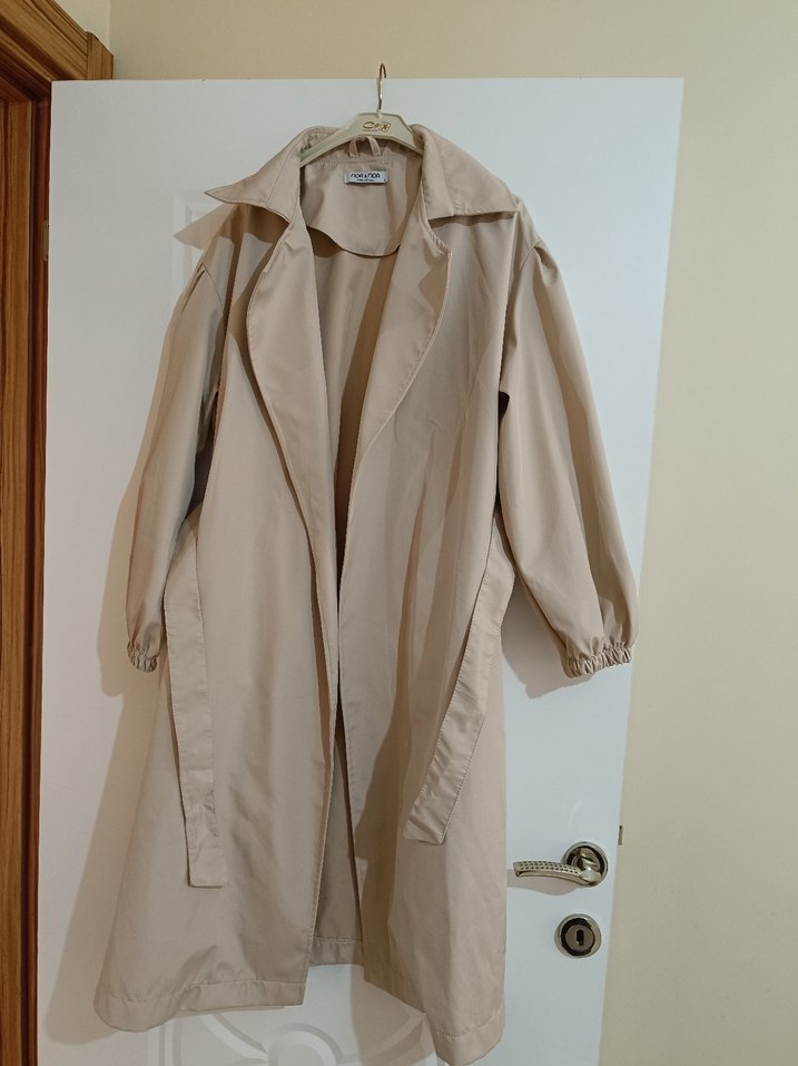 Bej renkli, keten kumaştan uzun ve bol kesim kadın trençkot. Notlu yaka ve uzun kollu, pastel tonuyla rahat ve şık bir görünüm sunar.