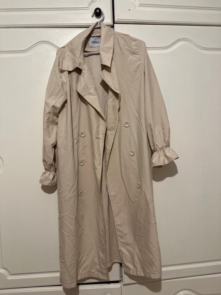 Bej renkli uzun keten trençkot, düğmeli ve bol kesimdir. Uzun kollu ve yakası kesik detaylıdır, günlük rahat şıklık için uygundur.