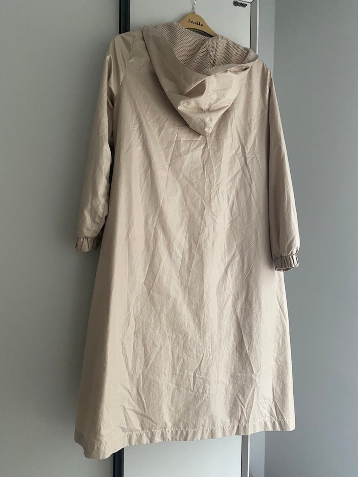 Bej renkli, keten kumaştan üretilmiş, kapüşonlu ve bol kesimli uzun yağmurluktur. Günlük kullanıma uygundur. ️