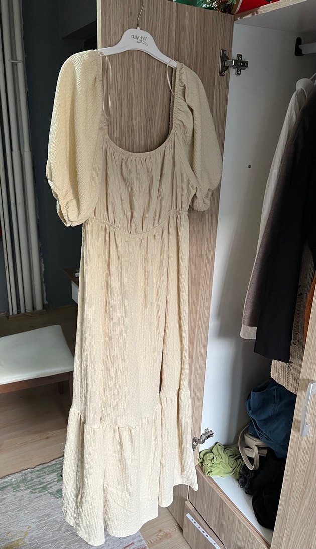 Bej uzun keten elbise, salaş kesim, drapeli detaylar, askılı kollar ve kayık yaka ile bohem tarzı yansıtıyor.