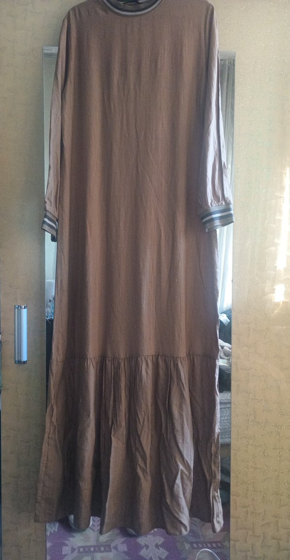 Bej renkli, keten kumaştan yapılmış, uzun ve salaş kesime sahip elbise. Kısa kollu ve yuvarlak yakalı, minimal bohem tarzını yansıtır. Günlük kullanım için uygundur.