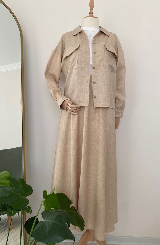 Bej renkli, keten kumaştan ikili takım. .uzun kollu, sade ve rahat kesimiyle günlük kullanım için uygundur. Detaylı ölçü verilir.