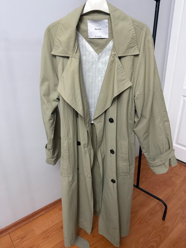 Bej renginde, keten kumaştan uzun ve bol kesim trençkot. Notlu yaka, kuşaklı bel ve askılı kollara sahiptir, desen içermez.