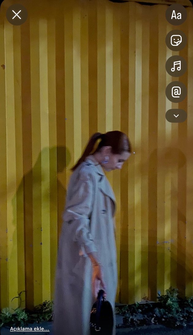 Bej renkli, keten kumaştan yapılmış uzun ve bol kesim trençkot. Uzun kollu, yaka kısmı çentikli ve düğmeli detaylara sahiptir. Orjinal marka