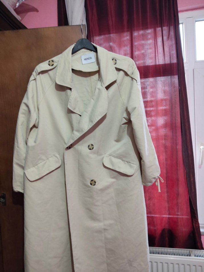 Bej renkte, uzun kesim keten trençkot. Düğmeli ve yakalı, salaş kesim, günlük şıklık sunar.