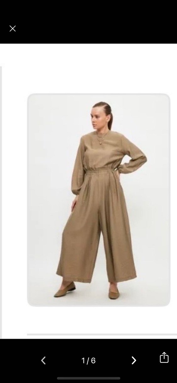 Bej renk, uzun keten tulum, salaş kesim ve drapeli tasarıma sahiptir. Uzun kollu, yuvarlak yakalı ve minimal bohem tarzındadır. Günlük kullanıma uygundur.