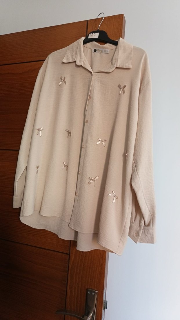 Bej renkli uzun kollu, düğmeli ve bol kesim gömlek. Üzerinde küçük fiyonk detayları bulunur, günlük kullanım için uygundur.
