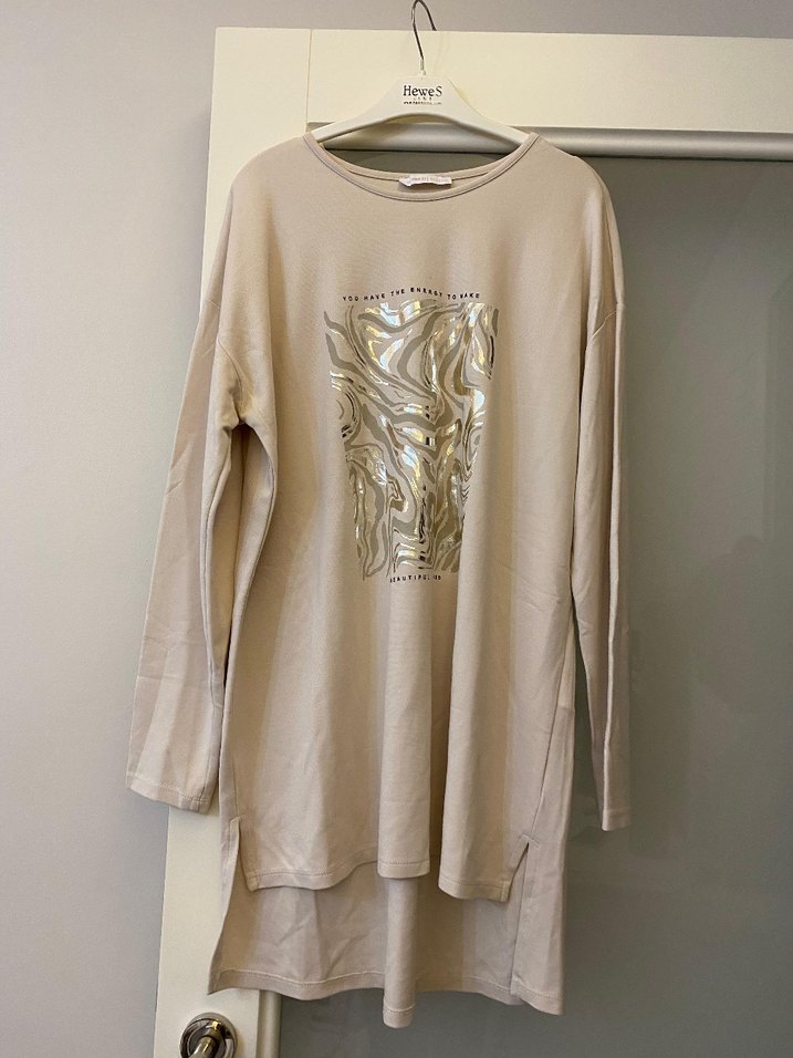 Bej renkte, uzun kollu, yuvarlak yaka ve bol kesim kadın tunik. Sentetik kumaştan, baskılı desenli ve drapeli uzun model, rahat ve şık bir görünüm sunar. giyilmedi tertemiz.kusuru yok.