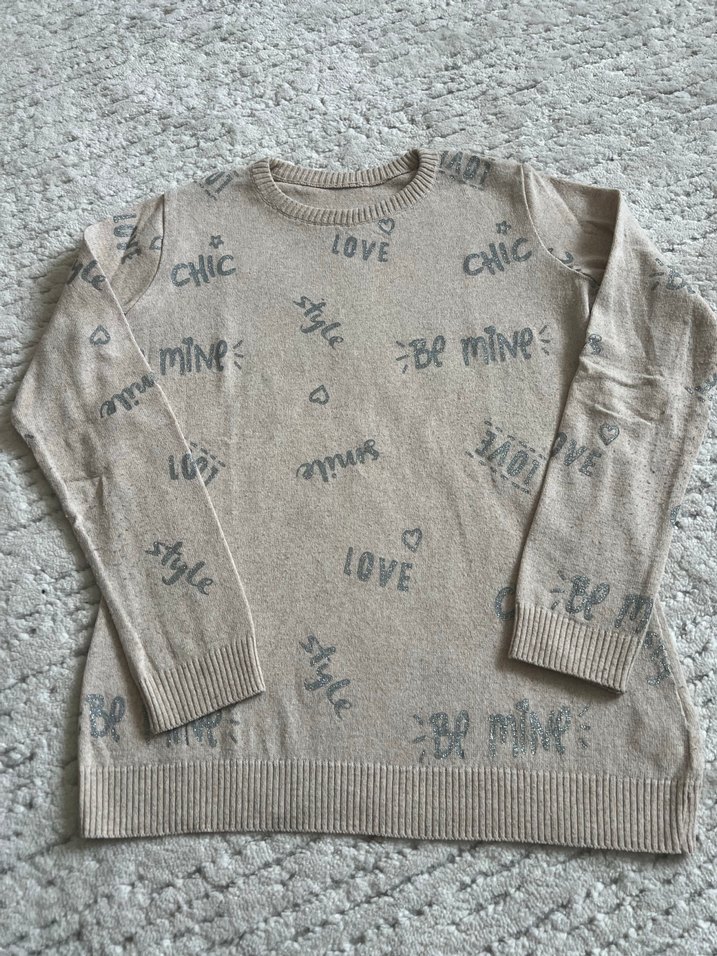 Bej renkte, uzun kollu ve bol kesim triko kazak. Üzerinde LOVE, CHIC gibi baskılar bulunur ve yuvarlak yakaya sahiptir. Günlük kullanıma uygundur.
