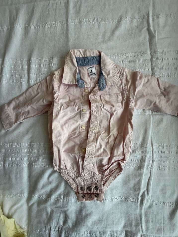 Düğmeli, uzun kollu ve yakalı bej renkli, yumuşak keten kumaştan bebek body gömlek.