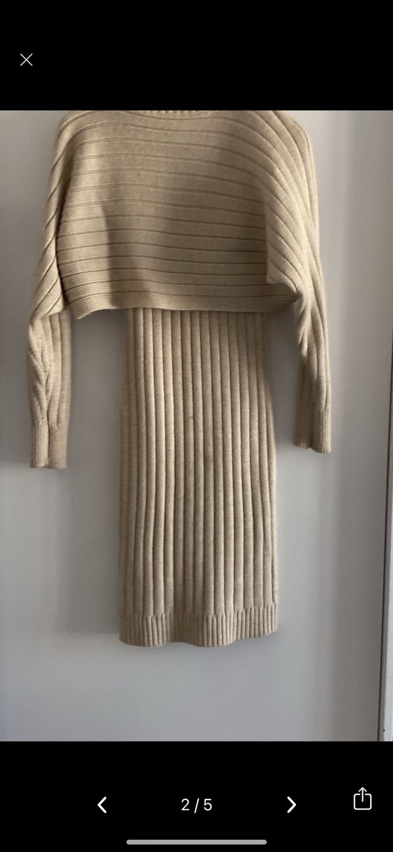 Bej Uzun Kollu Boğazlı Triko Elbise