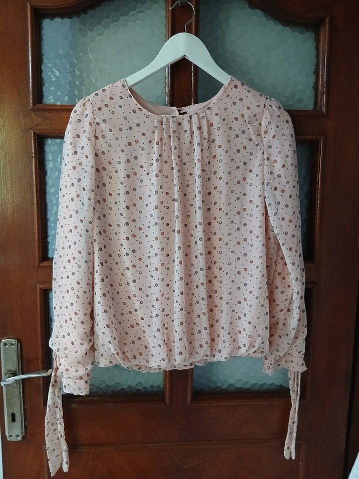 Bej renkte, uzun kollu, bisiklet yakalı, düğmeli ve bol kesim bluz. Pastel tonlarda desenli, midi boyda, bohem tarzda rahat bir model. marka bilgisi bulunmamakta