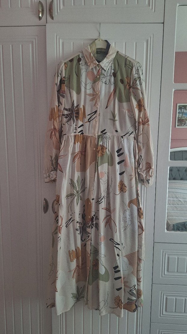 Bej renkte, uzun kollu ve drapeli, bol kesim, pastel desenli bohem tarzda uzun elbise. Yaka tipi gömlek yakadır.