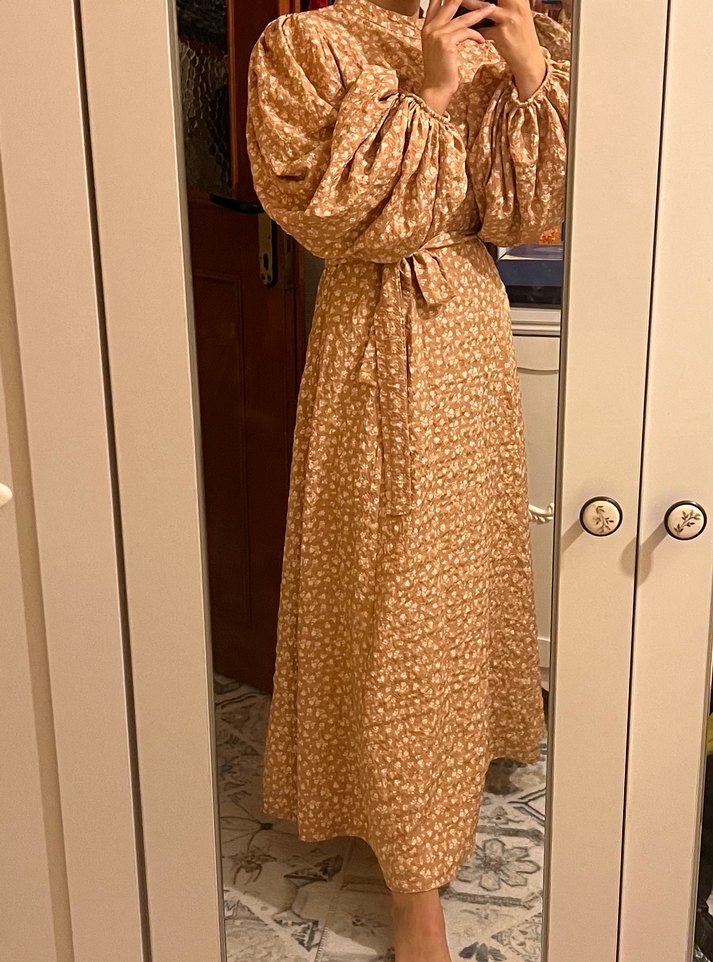 Bej renkte, uzun kollu, yüksek yakalı ve bol kesim olan bu elbise, yumuşak keten kumaştan üretilmiştir. Vintage bohem tarzı ve ince çiçek desenleri taşır. Günlük kullanım için uygundur. 3844 arası uyumludur beli kuşaklıdır