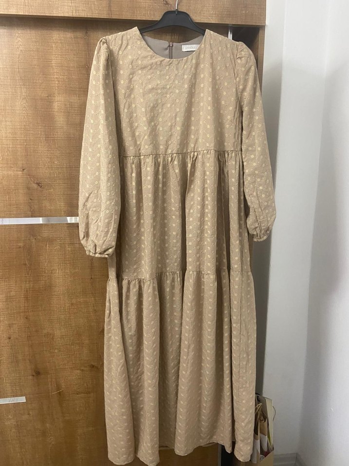 Bej renkte, uzun kollu ve yuvarlak yakalı bu uzun elbise, rahat kesimi ve ince keten kumaşıyla minimalist bohem tarzını yansıtır. İnce fırfır detayları bulunur.