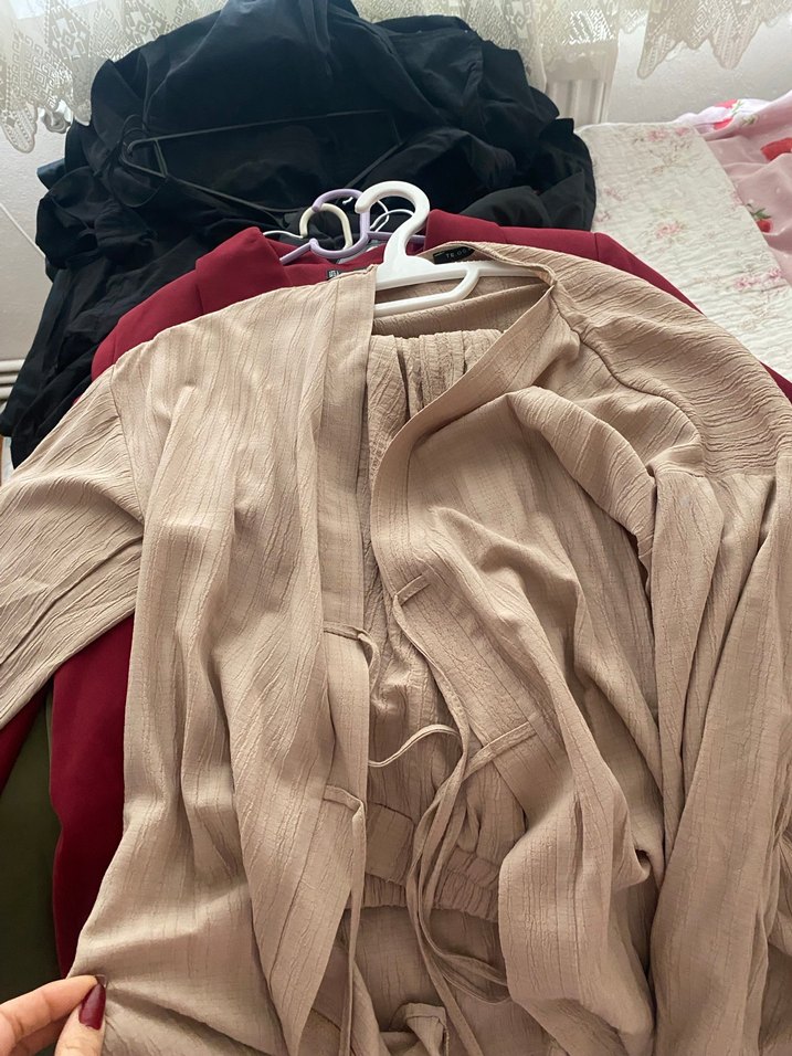 Kadınlar için bol kesim, uzun boy ve uzun kollu, desen içermeyen koyu bej renkli rahat bohem tarzında sabahlık.