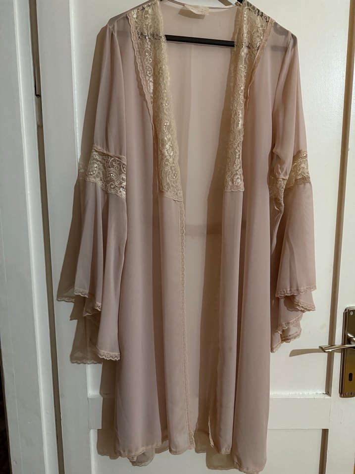 Bej renkte, bol kesim ve uzun kollu kadın sabahlık. Bohem tarzda, dantel detaylarla süslenmiş ve yumuşak pastel tonlarda.