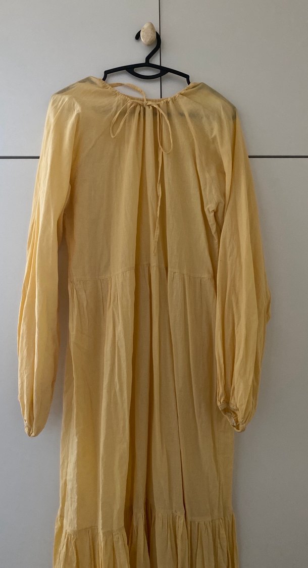 Bej renkte, keten kumaştan uzun kollu, bol kesim ve drapeli bohem elbise. Yelken yaka ve rahat kesimiyle şık bir tercih.