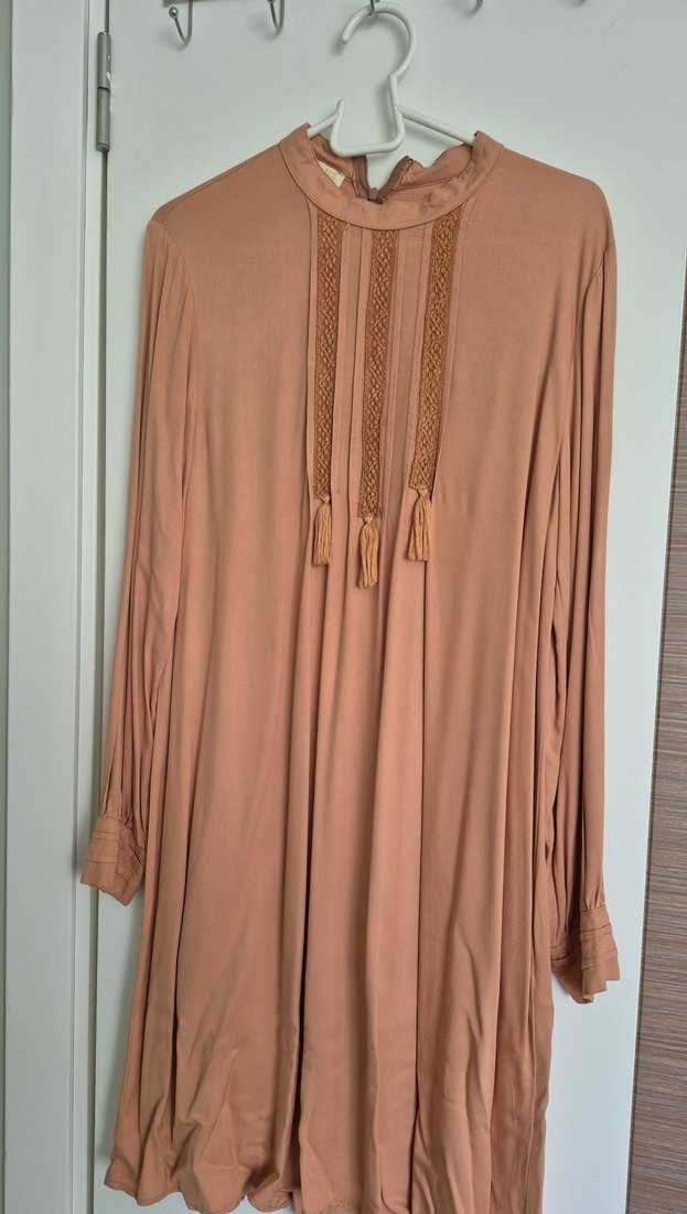 Bej renkli, uzun kollu, yüksek yakalı ve püsküllü nakış detaylı bol kesim tunik. İpeksi kumaştan, bohem tarzına uygun.