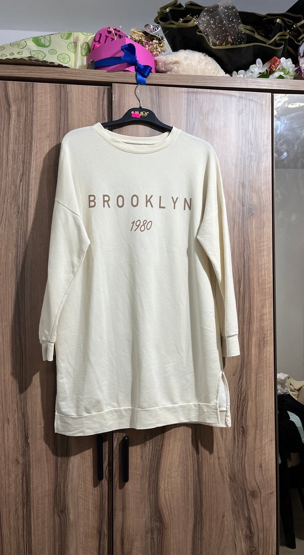 Pamuk kumaştan üretilmiş, uzun kollu ve bisiklet yaka bej renk kadın sweatshirt. 'BROOKLYN 1980' baskılı, rahat ve salaş kesim, günlük kullanıma uygun.