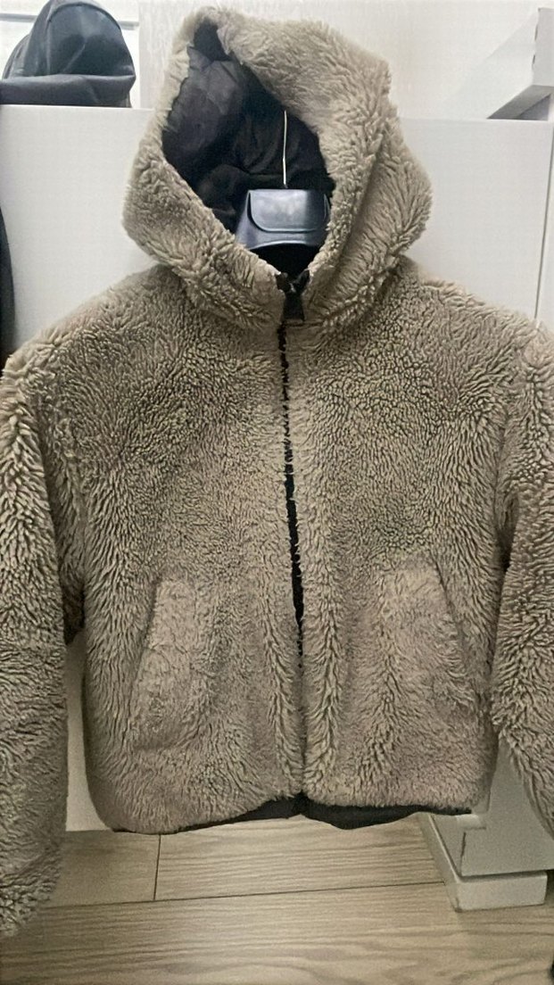 Bej renkli, uzun kollu ve peluş detaylı, vücuda oturan kesime sahip kadın ceketi. Bisiklet yaka ve fermuarlı kapama içerir, günlük kullanıma uygundur.
