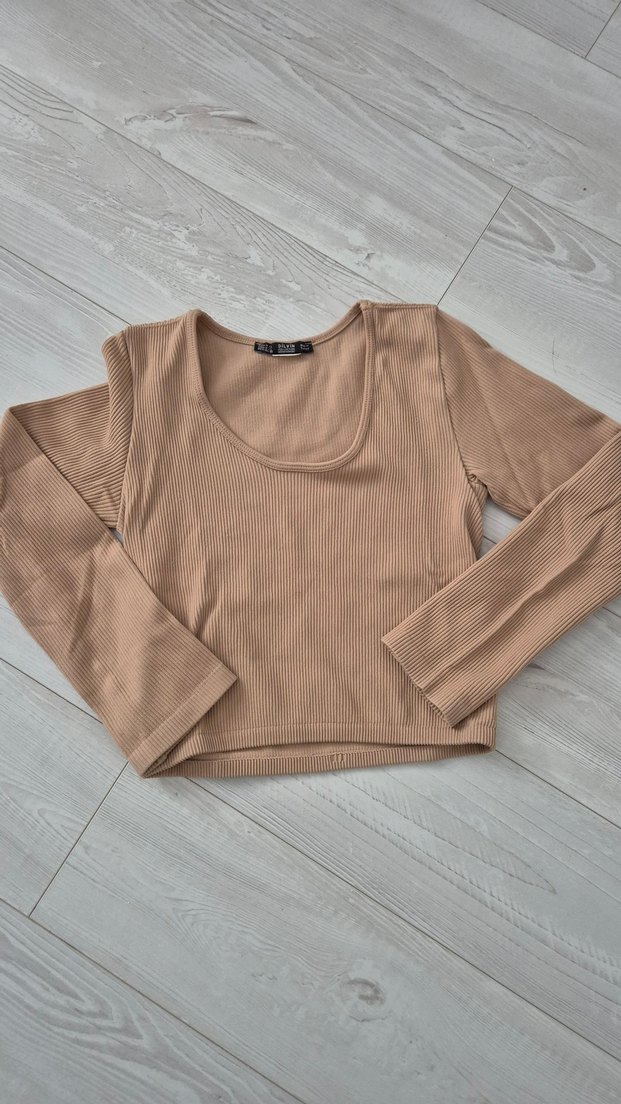 s bedene de uyar ..Bej renkte, uzun kollu ve yuvarlak yakalı, yumuşak sentetik kumaştan yapılmış dar kesim crop top. Düz ve pastel tonuyla rahat ve sokak stili sunar. ✨1 kez giyildi