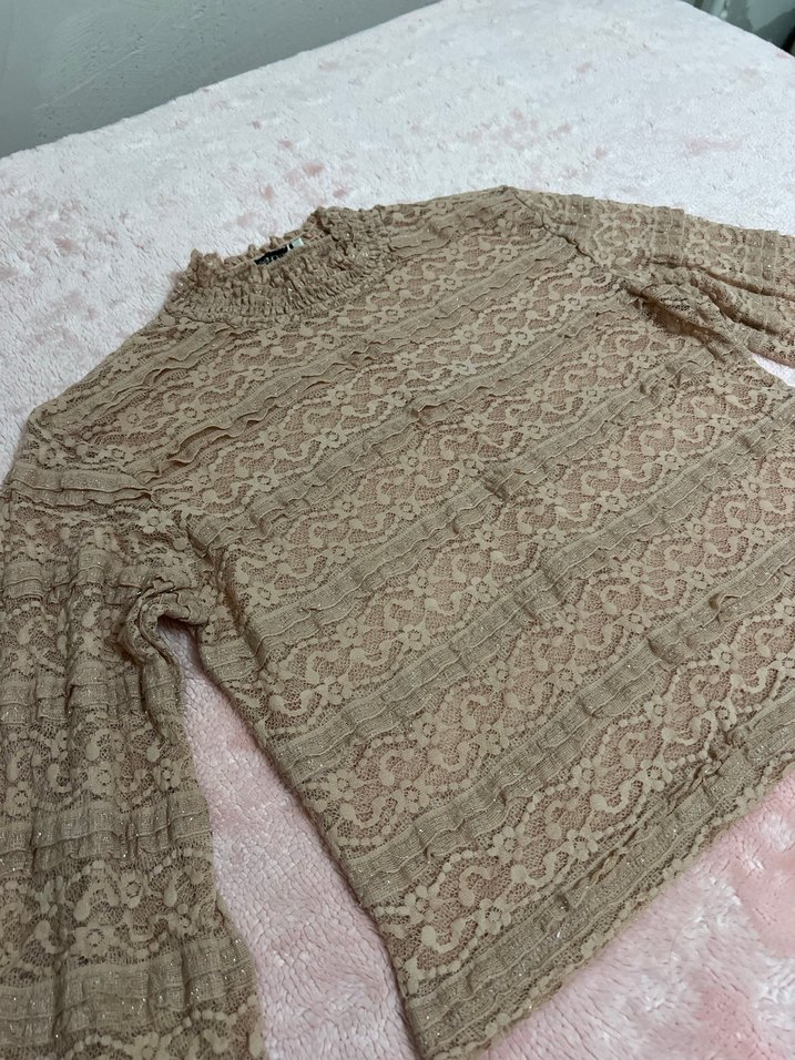 Bej renkte, uzun kollu ve dantel detaylı bu bluz, yumuşak triko kumaştan üretilmiştir. Yüksek yakalı ve bol kesimli, bohem tarzda günlük kullanıma uygundur.