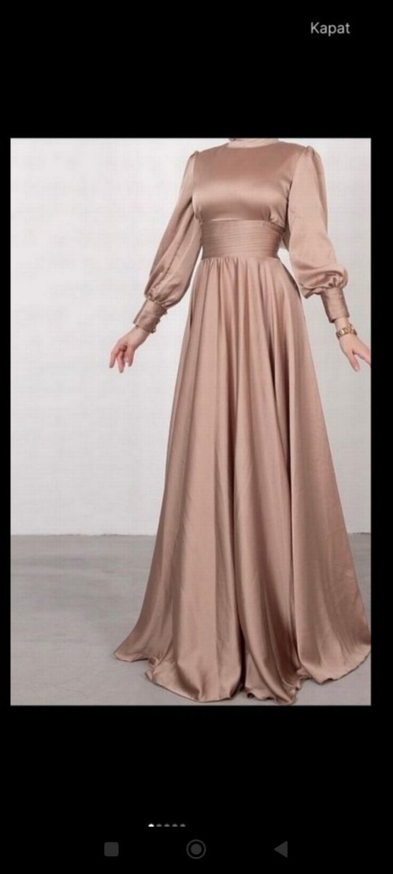 Bej renkli, uzun kollu, geniş kesim ve drapeli tasarıma sahip abiye elbise. Tekn modern klasik stil ve parlak kumaş ile düğün için uygundur.