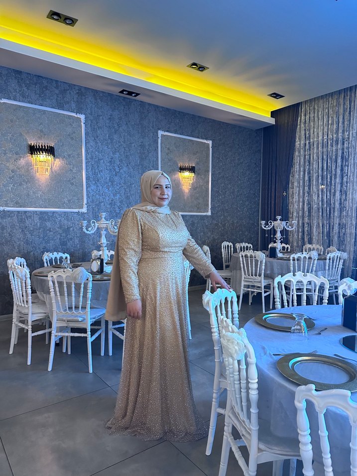 Bej renkte, uzun kollu ve yüksek yakalı drapeli abiye elbise. Düzenli kesimi ve sade tasarımı ile düğün için uygun, mütevazı ve şık bir bohem tarz sunar. ✨ Taşlı abiye sadece 2 saat giyildi 10.000 tl alındı