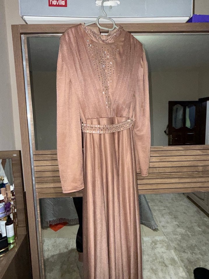 Bej Uzun Kollu Drapeli Abiye Elbise