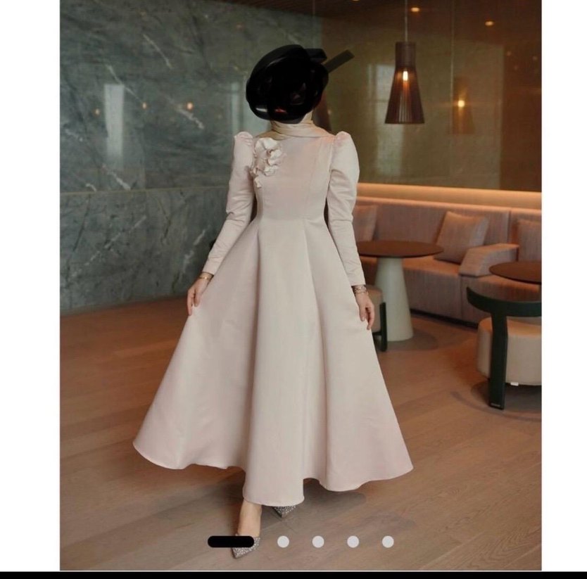 Bej renkli, uzun kollu ve yüksek yakalı drapeli abiye elbise. Modern klasik tarzda, düğünler için ideal, rahat kesim. Bir kere giyildi 36 beden