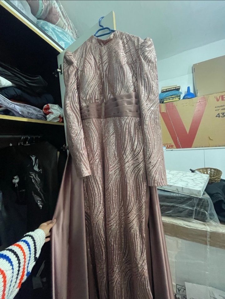 ŞAL İLE GÖNDERİLİCEKBej renkli, uzun kollu, drapeli ve yüksek yakalı abiye elbise. Parlak ve desen içermeyen kumaşıyla düğün ve özel günler için uygundur. ✨