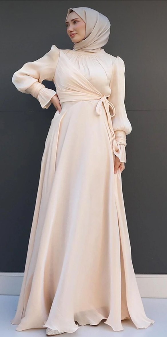 Bej renginde, uzun kollu ve yüksek yakalı drapeli abiye elbise. Belde bağlama detayı ve bol kesimi ile düğünler için uygun.