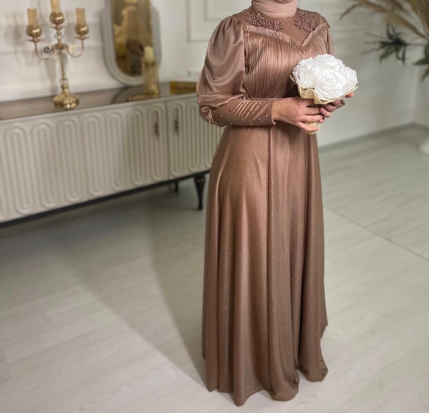 Bej renkte, uzun kollu ve yüksek yakalı, drapeli detaylara sahip uzun abiye elbise. Düğünler için modern klasik tarzda, rahat kesim sunar. ✨