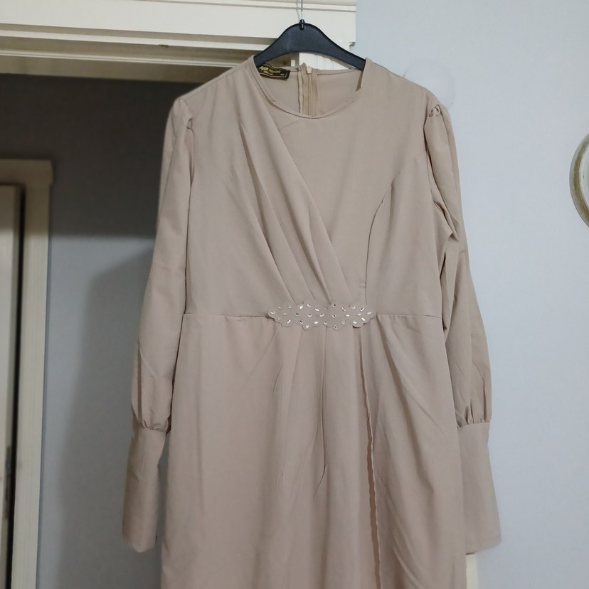 Bej Uzun Kollu Drapeli Abiye Elbise
