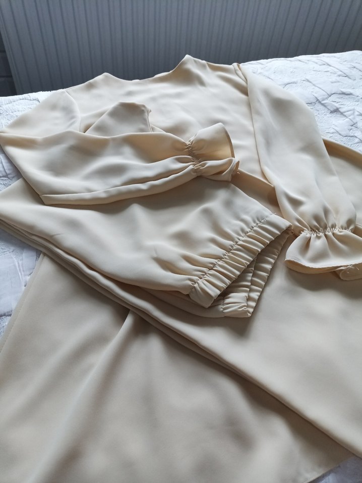 Bej renkte, uzun kollu ve drapeli tasarıma sahiptir. İpek gibi kumaştan üretilmiş, regular fit ve uzun boyda, minimalist ve çağdaş ofis stiline uygun.