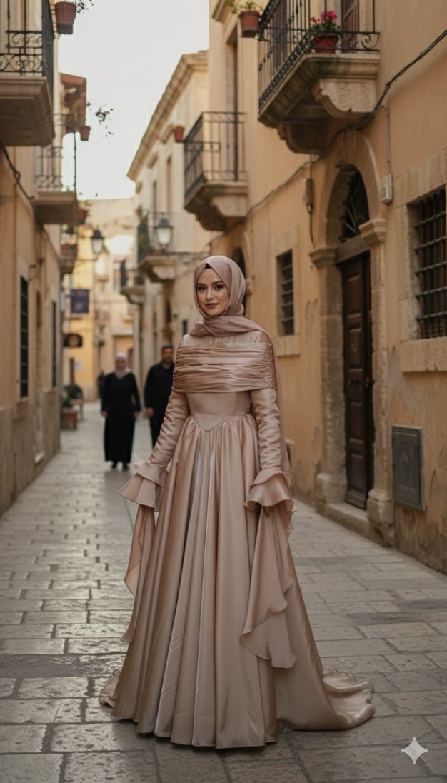 Yüksek yakalı, uzun kollu, bej renkte drapeli, uzun ve dar kesim kadın abiyesi. Düğün için uygun, mütevazı ve gösterişli tarzda.