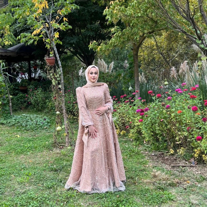 Bej renkte, uzun kollu, yüksek yakalı ve etnik desenli drapeli kadın abiyesi. Düzenli kesim ve gösterişli düğünler için uygun.