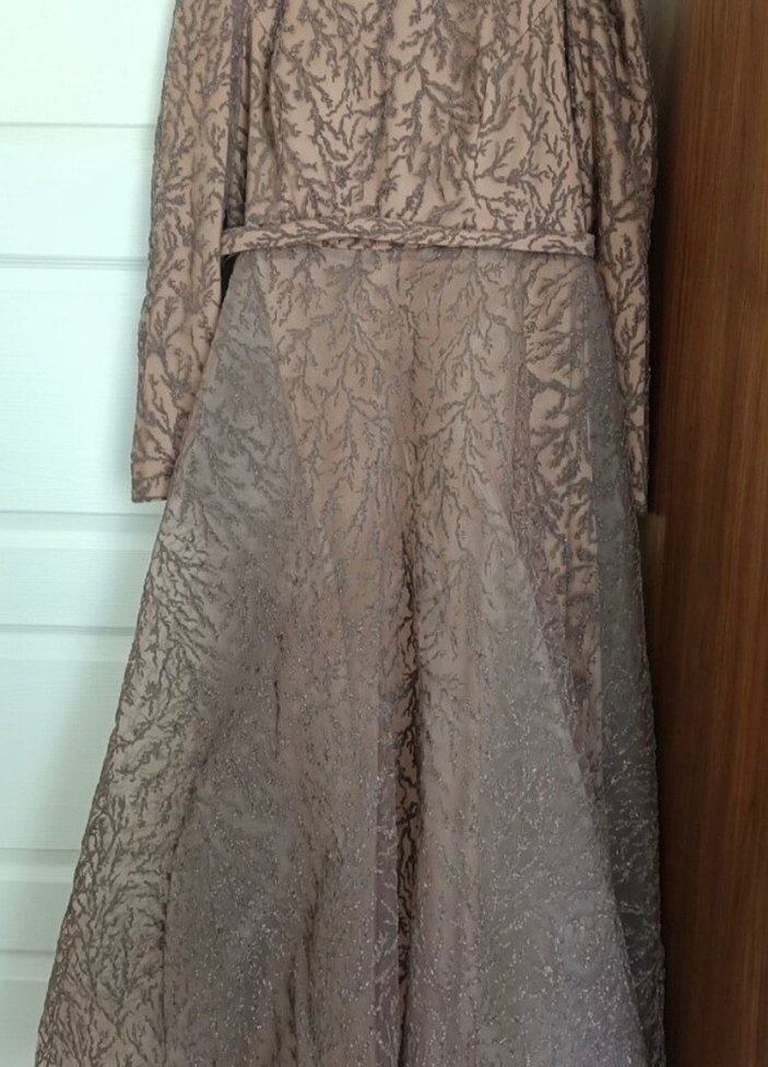 Bej renk, uzun kollu, drapeli detaylara sahip, kayık yaka ve regular kesim modern klasik tarzda kadın abiye elbise. Düğün için uygundur.✨