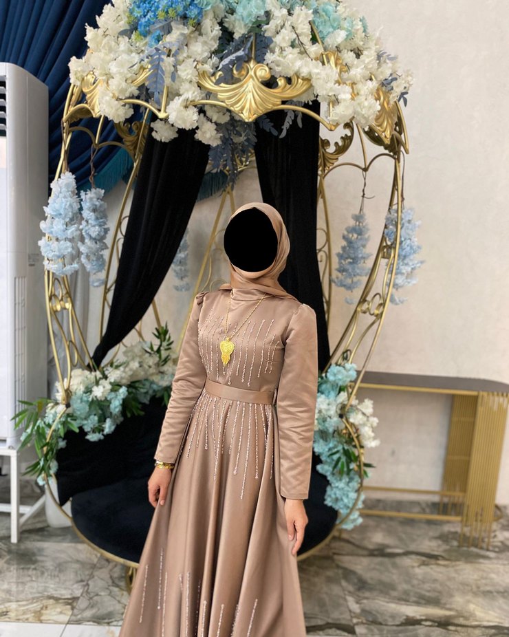 Bej renkli, uzun kollu, yüksek yaka ve drapeli tasarıma sahip, düzenli kesim kadın abiyesi. Düğünler ve mütevazı tarz için uygundur. ✨ 1 kere giyildi sıfıra yakın. 40 beden ama yanlardan içe doğru kesilmeden hafif daraltılmıştır.Şal dahildir!