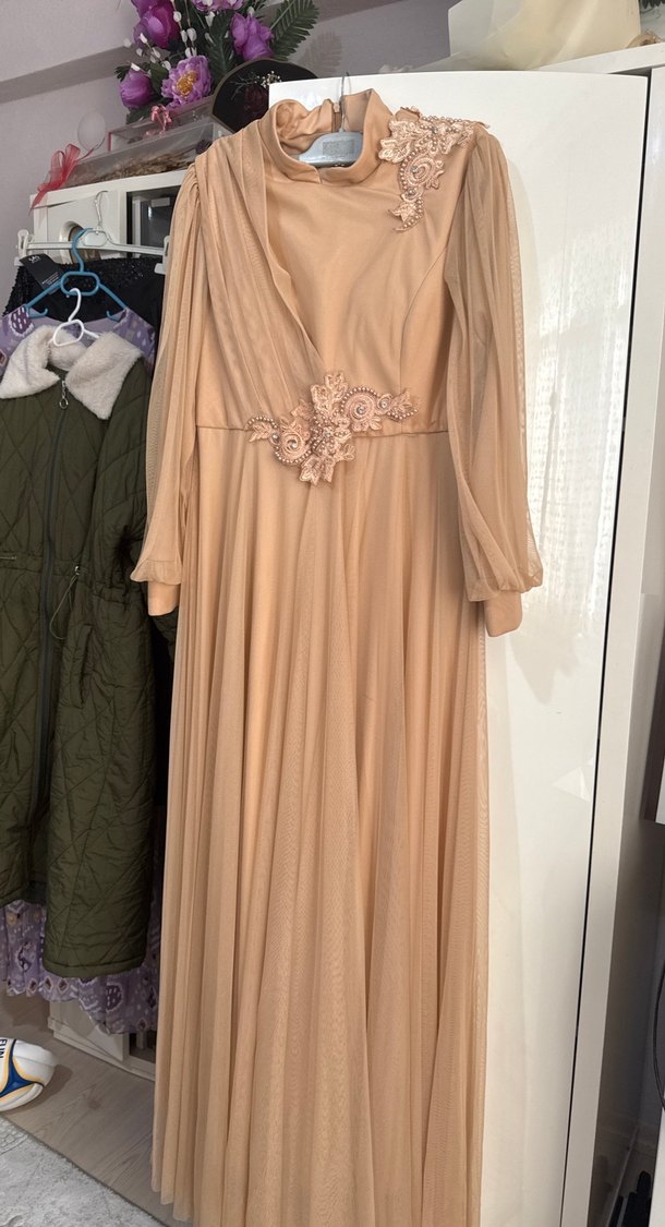 Bej renkli, uzun kollu ve kayık yaka kadın abiye elbise. Drapeli detaylar ve çiçek işlemeleri ile gelinlikler için uygun, bol kesim.